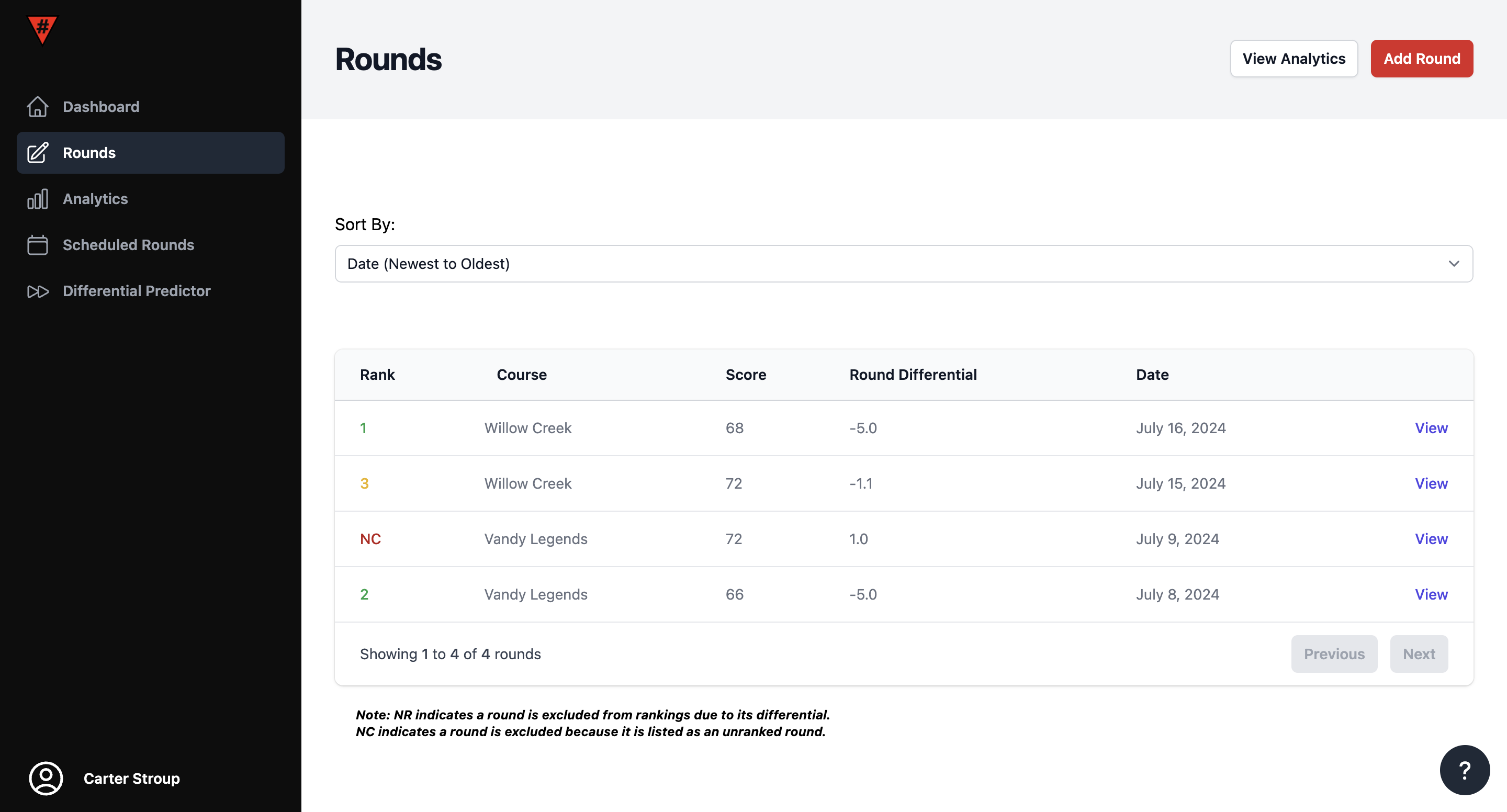 - Data Tracking and Analytics: Algorithmic calculation for differentials, ranked rounds, and predictive insights, along with tools for viewing, filtering, and managing statistics.